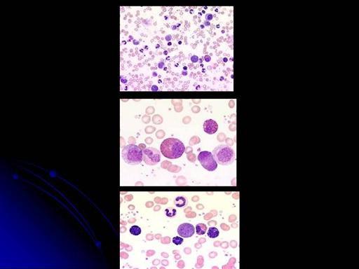 Picture 1. Blood film at 400X magnification demonstrates leukocytosis with the presence of precursor cells of the myeloid lineage. In addition, basophilia, eosinophilia, and thrombocytosis can be seen. Picture 2. Blood film at 1000X magnification demonstrates the whole granulocytic lineage, including an eosinophil and a basophil. Picture 3. Blood film at 1000X magnification shows a promyelocyte, an eosinophil, and 3 basophils. |