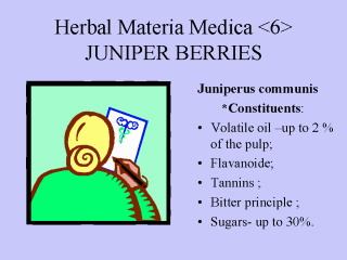 | Application: Juniper Berries have many traditional uses that are supported by modern practice, but it is as a urinary antiseptic suitable for cystitis and urethritis. Unfortunately, like many many of the others urinary antiseptics in the herbal Materia Medica Juniperus is not universally desirable and long term use is to be avoided. This is usually quite convenient as far as urinary infections are concerned, as satisfaction can often be achieved within six weeks that is the maximum recommended treatment. The problem with Juniperus is that it is irritating on several tissues: if the turpentine – like oil is inhaled it can cause cramps. In particular, it stimulates the uterine muscle; this leads to it use in bringing on a period but it also means that it is an abortifacient and must not be used in pregnancy. In reality, juniper is consumed by thousands daily in their gin and tonics. The recommended dose, for internal use is 10 g of berries to half liter of water, infuse in the usual way and take wineglassful doses 3 times per day before meals. Juniperus may be used externally in the form of oil , as part of a liniment for neuralgeia , arthritis and mayalgia. |