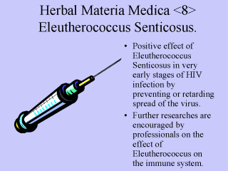 Eleutherococcus senticosus Recent research on the effect of Eleutherococcus on the immune system was performed using 36 healthy volunteers. In a placebo controlled double blind study subjects took about 6g of Eleutherococcus per day for four weeks. With the herbal treatment there was a highly significant increase in all lymphocyte compartments, which was specially pronounced for the helper T-lymphocytes. A general enhancement of the activation state of T-lymphocytes was also observed. There were no significant alterations in granulocyte or monocyte numbers as quoted by the authors. This might speculate about positive effect of Eleutherococcus in very early stages of HIV infection by preventing or retarding the spread of the virus. The medical, Pharmacognosy, and Phytotherapy students are encouraged to effect more research on Eleutherococcus. |