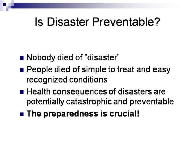 The likely effects of a disaster are dead and missing of the overall population or of some more vulnerable population’s group, mental and physical injuries, mental and physical diseases, secondary hazards (fire, disease etc), contamination of environmental media such as water, air pollution, soil…Displacement of people, damage to infrastructure, breakdown in essential services, loss of property and loss of income are other connected consequences of the major incidents and disasters that influence on the global and public health security The term "preparedness" covers all aspects, such as: prevention, protection, response and recovery. The term also covers the steps taken to minimise the threat of natural and man-made disasters including deliberate release of chemical, biological and radiological agents. The capacity to deal with disaster depends on a timely response and global preparedness planning. Therefore, every country should develop a core detection and response capacity, but also maintain a level of cooperation with other countries. If you have any comments or questions, please send a message to super1@pitt.edu |