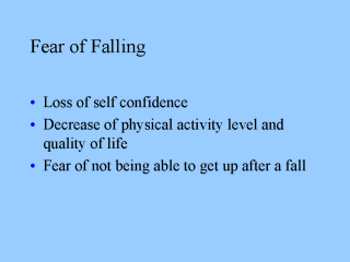 is not the only impact of a fall. As a psychological result of a fall, Fear of falling(Loss of confidence) may also limit the daily living activities. It is estimated that 20% of older persons who fear falling limit their activity. Limiting activity also may lead to increase frailty more, and result in recurrent fall occurrence. From New-Mexico Aging process study, for instance, about 33% of elderly populations developed a fear of falling after experiencing a fall, and it was significantly related to balance, gait, and cognitive disorders over time (Vellas, 1997). Also, fear of falling was related to lower quality of life. (Lachman et al., 1998) |