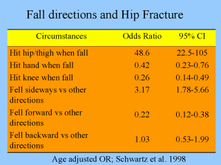| For example, Schwartz et al. (1998) demonstrated that hitting the hip or thigh in a fall resulted in significant risk of hip fracture (OR 48.6; 95% 22.5-105) in 214 hip fracture cases and 86 controls who had fallen, aged over 45 years. After adjusted for age, state of residence and others, risk of hip fracture tremendously increased. However, hitting the knee in a fall, or falling forward were related to reduced risk of hip fractures. |