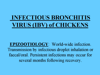 tracheal swabs. Rising antibody titres may be demonstrated in infected birds. CONTROL OF DISEASE: Combination of maternal passive and active immunity. Chicks are vaccinated within the first week with an attenuated vaccine by aerosol or in drinking water. Cross-serotype protection occurs but virus strains relevant to local area are used. |