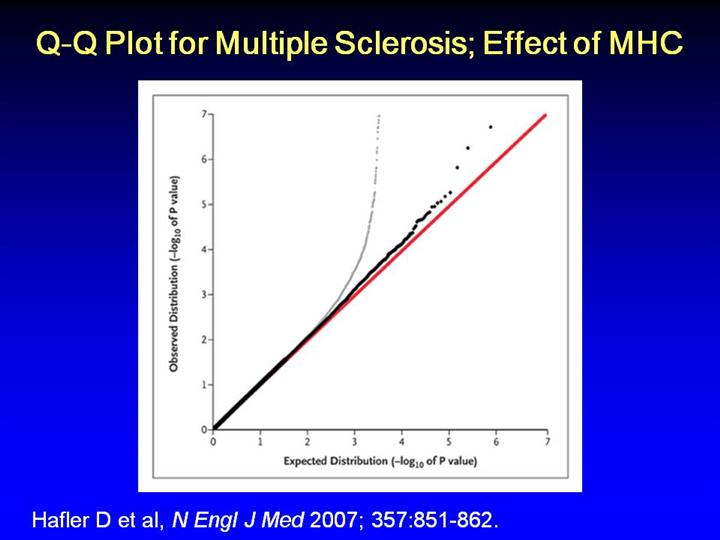 All 334,923 SNPs (gray), exclusion of SNPs across extended MHC region (black), excess at < 0.001 (- log 3) |