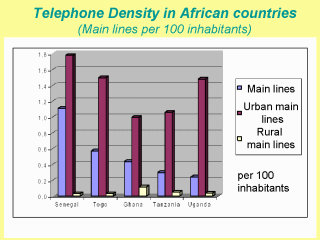 There is also a huge gap in telephone density between urban and rural areas in Africa.