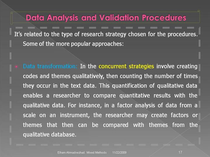 Data analysis in mixed methods research relates to the type of research strategy chosen for the procedures. Thus, in a proposal, the procedures need to be identified within the design. However, analysis occurs both within the quantitative (descriptive and inferential numeric analysis) approach and the qualitative (description and thematic text or image analysis) approach, and often between the two approaches. |