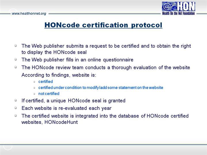Certification is free of charge to include the greatest number of sites Since the web site owner decides autonomously to apply, it is hoped their commitment to the principles will be authentic. Web site owners display the HONcode quality seal to identify themselves as members of a community which includes some of the most well known sites. The Certification process itself helps webmasters to understand the expectations of the critical site user and meet standards for inclusion in other databases. System obviously depends on the good will of the particpants, and the public is asked to report violations. The HONcode is not an award or prize nor does it guarantee of the scientific accuracy of the information contained.