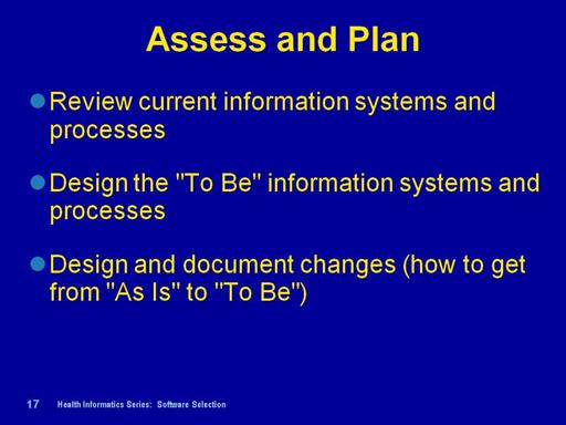 Current IS systems and processes: An assessment of the existing systems and processes must be performed. This will document the existing data collection, workflows, decisions, and responsibilities. In addition, the installed infrastructure should be assess to understand what human resources, information technology, and communication resources are in place currently.