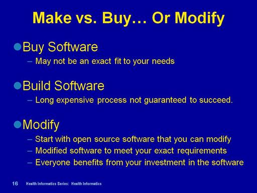 Often the decision on software is presented as a "build vs. buy" decision where you look for software that meets your needs and then buy it or you don't find software that meets your needs and then you have to build it from scratch. There is another option that is increasingly attractive. This is the "modify" option. You can start with software that meets some of your needs or which has a useful basic architecture and then modify it to meet all of your needs. This option is difficult with commercial proprietary software which requires that the vendor be agreeable to make the changes. (Often local vendors are not skilled or not permitted to make changes.) However, with open source software, you have access to the underlying instructions "source code" to the software so it becomes a much more feasible project to make the changes yourself or to hire someone to make the changes. Another advantage of this option is that the investment you make in changes to the software accrue to the benefit of you and others who use the software, rather than being locked up in a proprietary system