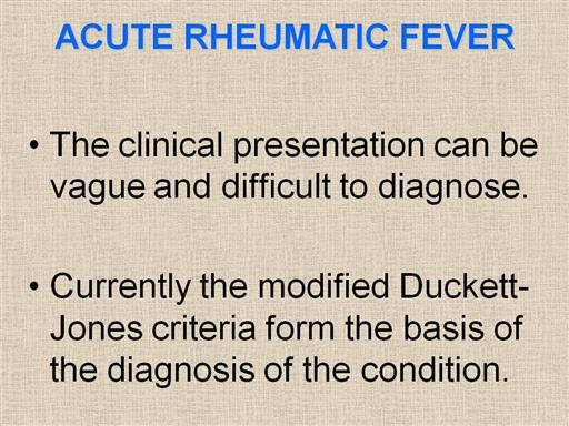 Acute rheumatic fever is a systemic inflammatory disease occurring as a sequel to beta haemolytic streptococcal infection. The clinical presentation can be vague, complex and difficult to diagnose. The modified Duckett-Jones criteria to establish the diagnosis arose from research in North America and Europe during the first part of the 20th century and may not apply in other parts of the world. It is thought that 0.3-30% of untreated group A beta haemolytic streptococcal infection progress to develop acute rheumatic fever. Gerber MA, Baltimore RS, Eaton CB, Gewitz M, Rowley AH, Shulman ST, Taubert KA. Circulation. 2009 Mar 24;119(11):1541-51. Epub 2009 Feb 26 |