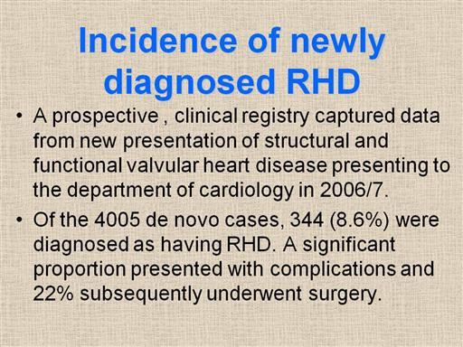 Incidence and characteristics of newly diagnosed rheumatic heart disease in Urban African adults: insights from the Heart of Soweto Study. Sliwa K, Carrington M, Mayosi BM, Zigiriadis E, Mvungi R, Stewart S.Eur Heart J. 2009 Dec 7.