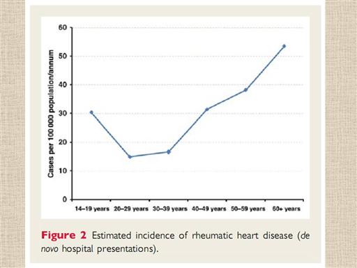Incidence and characteristics of newly diagnosed rheumatic heart disease in Urban African adults: insights from the Heart of Soweto Study. Sliwa K, Carrington M, Mayosi BM, Zigiriadis E, Mvungi R, Stewart S. Eur Heart J. 2009 Dec 7. [Epub ahead of print]