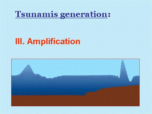 “III. Amplification: Several things happen as the local tsunami travels over the continental slope. Most obvious is that the amplitude increases. In addition, the wavelength decreases. This results in steepening of the leading wave, an important control of wave run-up at the coast. Note also that the deep ocean tsunami has traveled much farther than the local tsunami because of the higher propagation speed. As the deep ocean tsunami approaches a distant shore, amplification and shortening of the wave will occur.”
