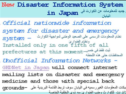 أحد المفاتيح للحد من آثار الكوارث هو في وضع وتنفيذ نظم المعلومات. الدكتور الجنرال اوشي من اليابان يناقش بإن نقل المعلومات في وقت حدوث الكارثة هو عنصر هام لمنع الوفيات والإصابات. انظر محاضرة السوبركورس : الكوارث ووظائف المستشفى على الرابط التالي( See Supercourse Lecture: Disasters and Hospital Functions (http://www.pitt.edu/~super1/lecture/lec0581/) |