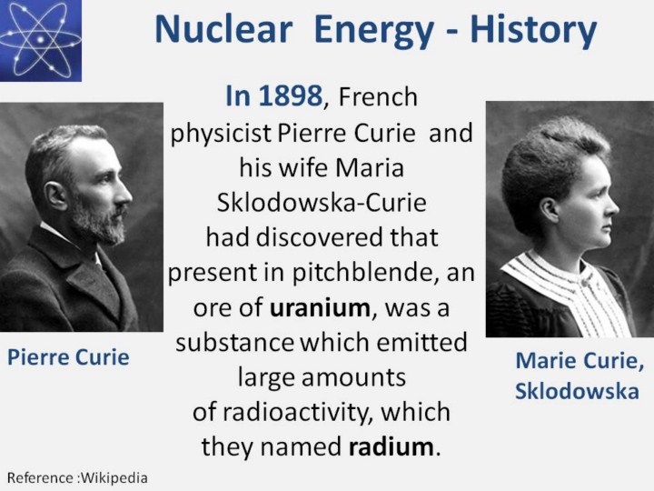 In the first decades of the twentieth century, physics was revolutionized with developments in the understanding of the nature of atoms. In 1898, French physicist Pierre Currie and his wife Maria Sklodowska-Curie had discovered that present in pitchblende, an ore of uranium, was a substance which emitted large amounts of radioactivity, which they named radium. This raised the hopes of both scientists and lay people that the elements around us could contain tremendous amounts of unseen energy, waiting to be tapped.