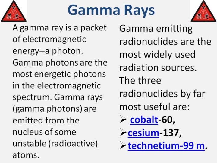 The properties of gamma radiation. Gamma radiation is very high-energy ionizing radiation. Gamma photons have about 10,000 times as much energy as the photons in the visible range of the electromagnetic spectrum. Gamma photons have no mass and no electrical charge--they are pure electromagnetic energy. Because of their high energy, gamma photons travel at the speed of light and can cover hundreds to thousands of meters in air before spending their energy. They can pass through many kinds of materials, including human tissue. Very dense materials, such as lead, are commonly used as shielding to slow or stop gamma photons. Their wave lengths are so short that they must be measured in nanometers, billionths of a meter. They range from 3/100ths to 3/1,000ths of a nanometer. Gamma rays and x-rays, like visible, infrared, and ultraviolet light, are part of the electromagnetic spectrum. While gamma rays and x-rays pose the same kind of hazard, they differ in their origin. Gamma rays originate in the nucleus. X-rays originate in the electron fields surrounding the nucleus or are machine-produced. Health Effects of Gamma Radiation Because of the gamma ray's penetrating power and ability to travel great distances, it is considered the primary hazard to the general population during most radiological emergencies. In fact, when the term "radiation sickness" is used to describe the effects of large exposures in short time periods, the most severe damage almost certainly results from gamma radiation. Protecting People from Gamma Radiation You need specialized equipment to detect gamma radiation. You cannot see, or feel radiation hitting your body. However, you should be familiar with radiation warning symbols. You can protect yourself by avoiding devices with this symbol, and not entering areas where the symbol is posted. In February of 2007, the United Nations introduced a new symbol to help reduce accidental exposure to large radioactive sources. The new icon is aimed at alerting anyone, anywhere to the potential dangers of being close to a large source of ionizing radiation. |