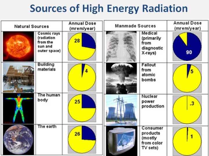 There are many sources of harmful, high energy radiation. Industrial radiographers are mainly concerned with exposure from x-ray generators and radioactive isotopes. It is important to understand that eighty percent of human exposure comes from natural sources such as outer space, rocks and soil, radon gas, and the human body. The remaining twenty percent comes from man-made radiation sources, such as those used in medical and dental diagnostic procedures. One source of natural radiation is cosmic radiation. The earth and all living things on it are constantly being bombarded by radiation from space. The sun and stars emits EM radiation of all wavelengths. Charged particles from the sun and stars interact with the earth’s atmosphere and magnetic field to produce a shower of radiation, typically beta and gamma radiation. The dose from cosmic radiation varies in different parts of the world due to differences in elevation and the effects of the earth’s magnetic field. Radioactive material is also found throughout nature. It occurs naturally in soil, water, plants and animals. The major isotopes of concern for terrestrial radiation are uranium and the decay products of uranium, such as thorium, radium, and radon. Low levels of uranium, thorium, and their decay products are found everywhere. Some of these materials are ingested with food and water, while others, such as radon, are inhaled. The dose from terrestrial sources varies in different parts of the world. Locations with higher concentrations of uranium and thorium in their soil have higher dose levels. All people also have radioactive isotopes, such as potassium-40 and carbon-14, inside their bodies. The variation in dose from one person to another is not as great as the variation in dose from cosmic and terrestrial sources. There are also a number of manmade radiation sources that present some exposure to the public. Some of these sources include tobacco, television sets, smoke detectors, combustible fuels, certain building materials, nuclear fuel for energy production, nuclear weapons, medical and dental X-rays, nuclear medicine, X-ray security systems and industrial radiography. By far, the most significant source of man-made radiation exposure to the average person is from medical procedures, such as diagnostic X-rays, nuclear medicine, and radiation therapy. http://www.ndt-ed.org/EducationResources/CommunityCollege/RadiationSafety/theory/sources.htm |