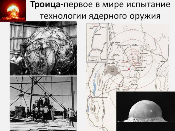 «Троица» — первое в мире испытание технологии ядерного оружия, произошедшее 16 июля 1945 года в штате Нью-Мексико, США. Во время испытания тестировалась плутониевая бомба имплозивного типа. Взрыв бомбы был эквивалентен приблизительно 21 килотонне тротила. Этот взрыв считается началом ядерной эпохи. Бомба Толстяк, сброшенная 9 августа 1945 года на город Нагасаки, была этого же типа. |