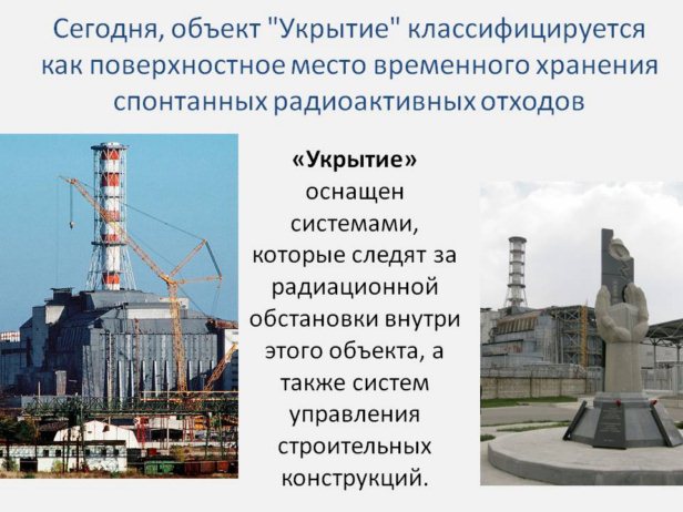 Следует отметить, что объект "Укрытие" является не только уничтоженный реактор Чернобыльской атомной электростанции. Объект "Укрытие" включает: уничтоженный Блок B второго этапа Чернобыля - четвертый блок; сооружения, построенных вокруг разрушенного реактора, де-аэратор (не машинный зал), часть блока B. Состав объекта "Укрытие" также включает в себя местную зону - территория, прилегающей к объекту - защитная зона, которая оборудована системами мониторинга и наблюдения. Структуру шелтера включает в себя элементы, предназначенные для выполнения работ для поддержания объекта в безопасном состоянии. То есть, сейчас шелтер - разрушенный тяжелой аварией 4-й блок Чернобыльской АЭС, который потерял все функциональные возможности устройства в котором реализуются приоритетные мероприятия по уменьшению последствий аварии и в котором продолжаются работы по обеспечению ядерной и радиационной безопасности. Текущие мероприятия на объекте «Укрытие» обеспечивают защиту для Чернобыльской АЭС, персонал зоны отчуждения, населения и окружающей среды от радиационной опасности, что обусловлено наличием ядерных и радиационно-опасных материалов. Более подробную информацию о состоянии объекта "Укрытие" Вы можете найти здесь - |