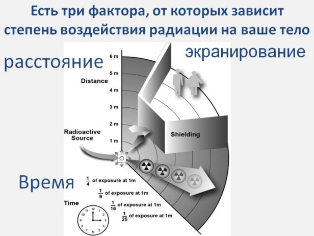 Время - Радиоактивность теряет свою силу со временем, некоторые из них в течение нескольких дней или менее, некоторые из них в течение многих лет. Ограничение времени нахождения рядом с источником излучения уменьшает количество радиоактивного облучения которое вы получите. После аварии, местные органы власти будут отслеживать любые выбросы радиации и определят уровень защитных мер, а также момент когда угроза миновала.