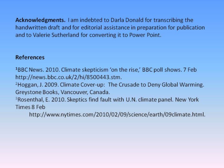 1BBC News. 2010. Climate skepticism ‘on the rise,’ BBC poll shows. 7 Feb http://news.bbc.co.uk/2/hi/8500443.stm. 2Hoggan, J. 2009. Climate Cover-up: The Crusade to Deny Global Warming. Greystone Books, Vancouver, Canada. 3Rosenthal, E. 2010. Skeptics find fault with U.N. climate panel. New York Times 8 Feb http://www.nytimes.com/2010/02/09/science/earth/09climate.html.