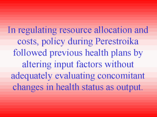 | Optimization of health status was achieved by increasing the volume of services as the most important type of input to the delivery system. Improvements in medical services were specified as increases to the number of beds, number of visits per shift for outpatient polyc1inics, number of rural outpatient clinics, number of physicians and midlevel personnel. The assumption that increases in the volume of medical services would improve general health status persisted during Perestroika. |