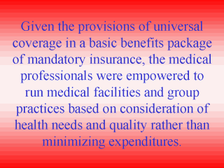 | The insurance companies could choose which medical providers and facilities would participate in their benefit plans, and shared responsibility for the legal accreditation of the facilities. The insurance companies could not refuse to provide the minimal levels of mandatory insurance, but were given the authority to offer many different benefit plans. |