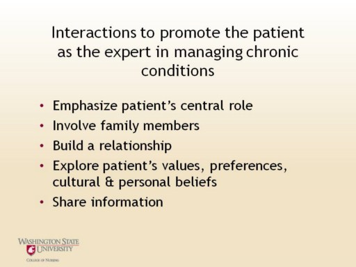 In the next few slides, we’ll review the key concepts they’ve identified as important to implement for self-management support. This slide and the next one provide tips for health care professionals to implement during every interaction with the patient and the family to promote the patient as the expert in managing his or her chronic condition.