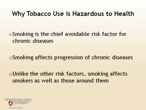 • Smoking is a well known risk factor for cardiovascular diseases, cancers, lung diseases and many more. •Individuals with chronic diseases and smoke are at high risk for irreversible complications such as sudden cardiac events or disabilities because smoking contributes significantly to deterioration of the chronic diseases •Risk factors like eating unhealthy food or physical inactivity affects individuals who adopt these behaviors only; however, smoking affects smokers and non-smokers (passive smoking) •Smokers may need higher doses of medications because smoking alters many medications metabolism. Benowitz N. & Zevin S. (1999). Drug Interactions with Tobacco Smoking: An Update. Clinical Pharmacokinetics, 36 (6), 425-438. |