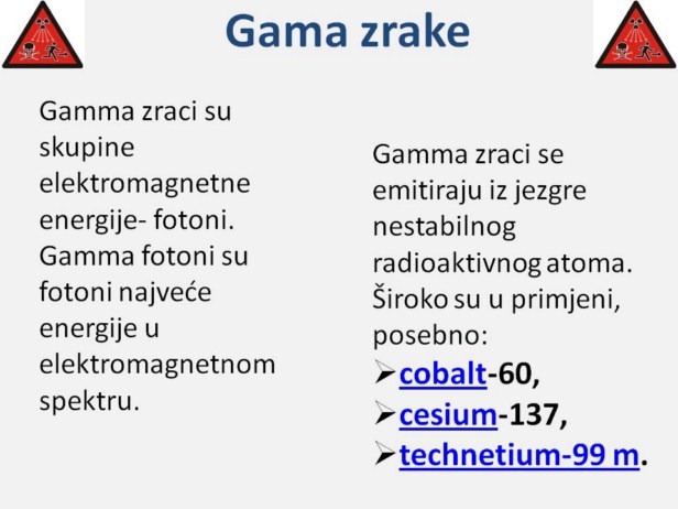 OSOBINE GAMA ZRAČENJA Gama zračenje je visoko energetsko jonizirajuće zračenje. Gama fotoni imaju oko 10 000 puta veću energetsku vrijednost od fotona u vidljivom rasponu elektromagnetnog spektra. Gama fotoni nemaju masu ni električni naboj- oni su čista elektromagnetna energija. Zbog svoje energije putuju brzinom svjetlosti i mogu preći stotine do hiljade metara. Mogu proći kroz različite vrste materijala, uključujući i ljudsko tkivo. Veoma čvrsti materijali, kao što je olovo, često se koriste kao štit da uspore ili zaustave gamma fotone. Talasna dužina im je veoma kratka i mjeri se nanometrima, bilionitim dijelovima metra. Raspon im je 3/100 hiljada do 3/1000 hiljada nanometara. Gamma zraci i X-zraci kao vidljiva infracrvena i ultraljubičasta svjetlost, dio su elektromagnetnog spektra. Iako su štetni na sličan način, različitog su porijekla. Gamma zraci potiču iz jezgra. X-zraci potiču iz elektronskog polja oko jezgra, a mogu se dobiti i vještačkim putem. Uticaj gamma zračenja na zdravlje Zbog svoje prodorne moći i mogućnosti prelaženja duge distance, smatra se da gama zraci nose osnovnu opasnost po opću populaciju u nuklearnim nesrećama. Odnosno kada se upotrebljava termin „radijacijsko oboljenje“ obično se odnosi na efekte ekspozicije gamma zračenju visokog intenziteta, u kratkom vremenskom periodu.