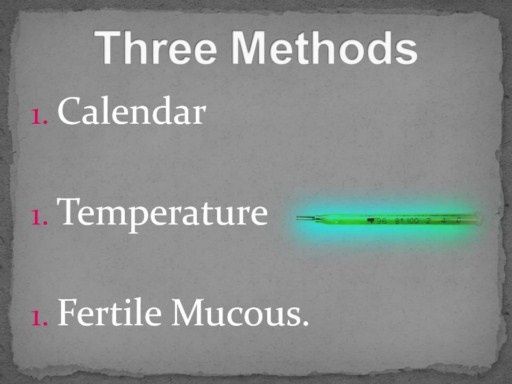 The three methods are = Calendar, Temperature and Fertile Mucous. I find by using these methods together, you are more accurate in predicting when you are fertile. You may also notice changes such as pain in the area of the ovaries, water retention, low backache and breast tenderness. |
