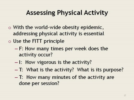 The FITT Principle Frequency, Intensity, Time, and Type of exercise Frequency 3-5 days/week More frequent exercise is desirable, but focus on establishing a regular exercise habit before recommending levels that may not be sustainable in the long term Intensity Start at a low to moderate intensity and gradually progress over several weeks or months to more vigorous efforts Emphasis should be on increasing duration rather than intensity, with the goal of optimizing caloric expenditure. Time 30 to 60 minutes, using a gradual progression Multiple short bouts produce similar benefits as a single long bout of the same total duration. Type Low-impact activities (e.g., walking, cycling, low-impact aerobics, water exercise) that are convenient, accessible, and perceived as enjoyable by the patient