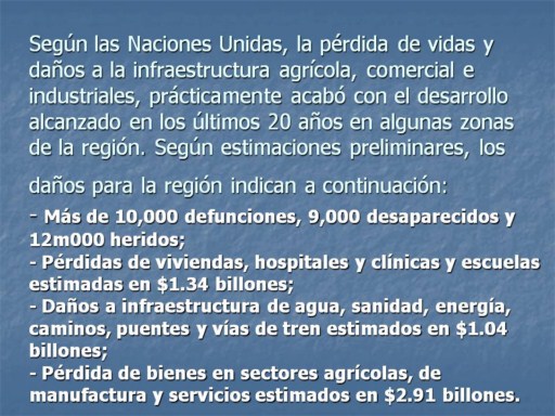 Se estima que el huracán Georges causó 400 víctimas y más de 180 millones dólares daños totales, incluidas las pérdidas indirectas y secundarias en Haití. La sinergia perversa de la pobreza abrumadora, el medio ambiente degradado, y la falta de infraestructura hace a Haití un país "propenso a los desastres". Casi todos los años, grandes segmentos de la población sufren o de sequía prolongada, inundaciones frecuentes, o deslizamientos de lodo. Una estrategia eficaz de reconstrucción deberá referirse específicamente a aumentar la capacidad local en Haití para hacer frente a catástrofes recurrentes.