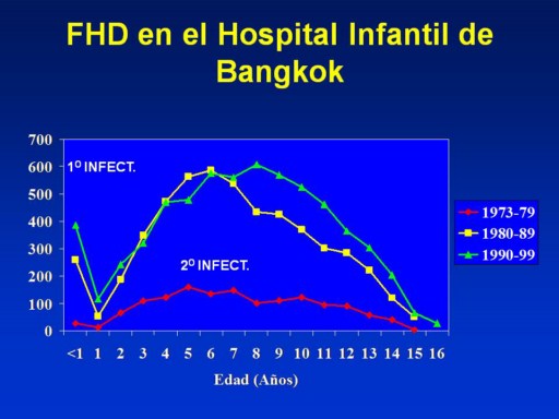 Ditribución del promedio de edad de niños hospitalizados con dengue hemorrágico en Bangkok durante la década de 1970, 80 y 90. Dos características destacan: 1) distribución bimodal, con un modo entre los lactantes; 2) la edad modal de hospitalización constantemente se mueve hacia arriba (5 a 9 años). Dengue hemorrágico en niños acompaña a las infecciones primarias, mientras que el dengue hemorrágico en niños de 1 año y mayores, acompaña a las infecciones secundarias por dengue. |