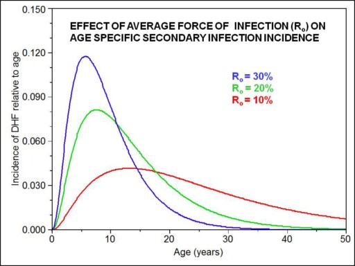 Este cambio en la edad de aparición de infecciones secundarias por dengue en cuatro virus del dengue circulantes están directamente relacionados con la virulencia de la infección (tasa de infección). Las bajas tasas de infección anual retardan la probabilidad de sufrir infecciones secundarias de dengue en comparación con las tasas de infección más altas. |
