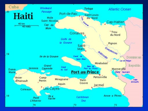Haití, se muestra la localización de Puerto Príncipe, ciudad capital y sitio donde las tropas de Naciones Unidas aterrizaron en 1994. De 517 casos sospechosos de dengue, se aislaron 185 virus: DENV 1 = 65; DENV 1 = 73; DENV 4 = 47.