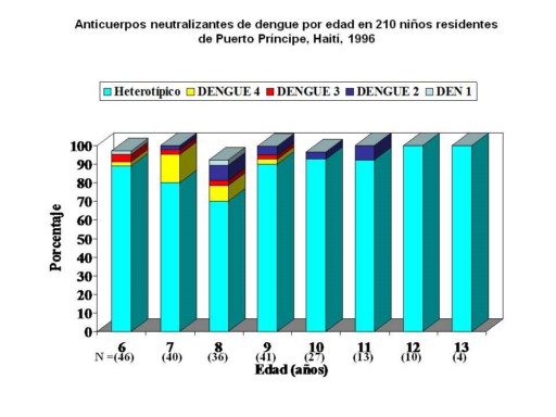 Los altos niveles de anticuerpos neutralizantes multitípicos del dengue circulan en los niños haitianos, entre las edades 6 a 13 años. anticuerpos neutralizantes del dengue monotípico a cada uno de los cuatro virus del dengue se encontraron. Tipos de virus del dengue 1,2 y 4 habían sido recuperados por el personal de la ONU en 1994-6 incluyendo el genotipo asiático de DEN 2 asociado a FHD/SCD (Halstead et al 65:180-183, 2001).