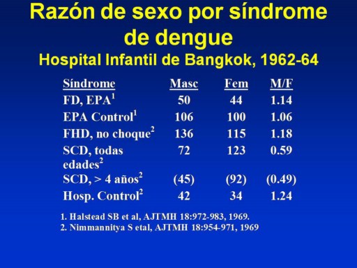 Femeninos de Bangkok de 4 años de edad y mayores tiene un incremento de riesgo para SCD. Estudios previos habían establecido que las tasas de infección del virus del dengue eran iguales entre hombres y mujeres en población abierta de niños de Bangkok (Halstead SB et al AJTMH 18:997-1021, 1969). FD Fiebre de dengue EPA Enfermedad en población abierta Bangkok females 4 years and older are at increased risk to DSS. Previous studies had established that dengue virus infection rates were equal in male and females in the open population of Bangkok children (Halstead SB et al AJTMH 18:997-1021, 1969).