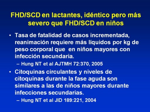 FHD/SCD en lactantes es difícil de diagnosticar y con frecuencia no se reconoce en hospitales pequeños comunitarios. En Tailandia, Myanmar (Burma), Vietnam e Indonesia, infecciones primarias en lactantes contribuyen con no menos del 5% del total de casos de FHD/SCD. Anticuerpos anti-dengue pasivos de madres se han identificado como factores de riesgo. Pero como los casos ocurren predominantemente durante un periodo de seis meses, las tasas de ataque son mayores en este grupo de edad que en cualquier otro grupo.