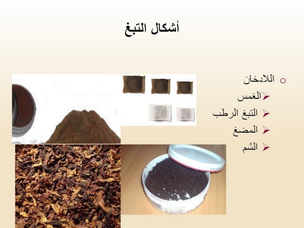 التبغ الممضوغ: عبارة عن اوراق التبغ اليابسة توضع في الفم ما بين اللثة وجدار الفم.