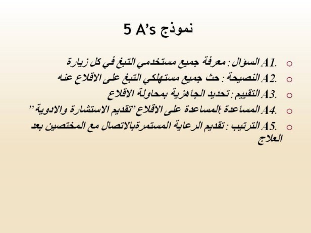 To receive training on the 5 A’s model click on this link: http://rxforchange.ucsf.edu/. Section 5 of the course provides training on treating tobacco dependence using the 5 A’s |