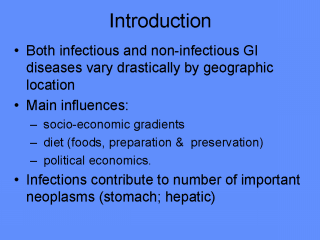three main headings: 1. Socio-economic - largely related to variations in wealth. For example, in under-developed nations chronic under-nutrition and, in extreme cases famine, not only make whole communities less able to resist common infections, they may result in frank starvation. However, even during famine, it is seldom the wealthier people in urban areas who die. Usually, it is the rural poor who are most at risk. In developed or post-industrial nations, inadequate or poor nutrition such as diets low in fresh fruits, vegetables and often high in fat content may result in increased vulnerability to coronary heart disease, cancer and type 2 diabetes mellitus. In addition, viral or bacteria contamination may be more likely. 2. Dietary, deriving partly from 1. above but also being culturally determined. Most cultures have foodstuffs which are known to be hazardous. Often, these traditional foods are preserved, such as the salted dried fish popular in Southern China & Hong Kong, the hot salty tea of the Kashmir Valley in Northern India, quat and betel nut, mild narcotic "digestifs" taken in the Middle East and Indian sub-continent, all of which have been linked to increased risk of GI tumours, such as those of the oesophagus. "Modern" fast food diets are increasingly being targeted as increasing risk for colon cancer. 3. Political-economic factors, often involving industrial or particular political considerations, such as war and civil disorder. War disrupts food supplies, troops destroy or steal crops, leaving communities without food. Less dramatic, but more widespread, intensive commercial pressure promotes less nutritious, expensive processed foods that acquire high status, at the expense of cheap or free local alternatives. An example is the use of baby milk formula instead of breast feeding. While GIDs may be classified into infectious and non-infectious, there is good reason to suspect that many GI tract malignancies involve infectious agents. |