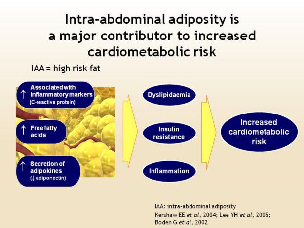 This slide summarises the relationships between intra-abdominal adiposity (IAA) and increased cardiometabolic risk. Intra-abdominal adiposity drives the progression of multiple risk factors directly, through the secretion of excess free fatty acids and inflammatory adipokines, and decreased secretion of adiponectin. The important contributions of IAA to dyslipidaemia and insulin resistance provide an indirect, though clinically important, link to the genesis and progression of atherosclerosis and cardiovascular disease. The location of excess IAA is an important determinant of cardiometabolic risk. IAA is associated with insulin resistance, hyperglycaemia, dyslipidaemia, hypertension, and prothrombotic/proinflammatory states. Excess IAA typically is accompanied by elevated levels of C-reactive protein (CRP) and free fatty acids (FFAs), as well as decreased levels of adiponectin. Elevated CRP is an indicator of inflammation. Abdominal obesity has been shown to be associated with the inflammation cascade, with adipose tissue expressing a number of inflammatory cytokines. Inflammation is now believed to play a role in the development of atherosclerosis and type 2 diabetes. Elevated levels of CRP are considered to be predictive of cardiovascular disease and insulin resistance. Elevated FFA levels appear to play a significant role in the cause of insulin resistance. It has been suggested that elevated FFAs and intracellular lipids inhibit the insulin signaling mechanism, leading to decreased glucose transport to muscle. FFAs also play a mediating role between insulin resistance and β-cell dysfunction, indicating that a reduction in FFA level could be a desirable therapeutic target. Adiponectin is an adipose tissue-specific circulating protein which is involved in the regulation of lipid and glucose metabolism. Adiponectin has been shown to be reduced in adults with obesity and type 2 diabetes. In non-diabetics, hypertriglyceridaemia and low HDL-cholesterol have been shown to be associated with low plasma adiponectin concentrations. All of these components help to explain why excess abdominal adiposity is considered to be a great threat to cardiovascular and metabolic health.