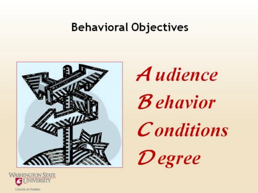 Audience- The student Behavior- identify an older adult’s risk for pressure sores Conditions- in their next clinical day Degree- all items of the tool calculated and scored.