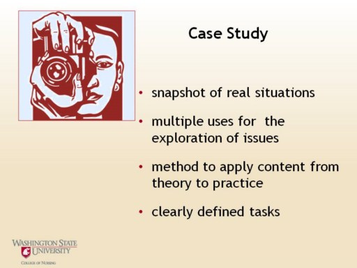Case studies that are authentic, realistically complex and presented in a way that makes the complexity manageable are the richest learning activity. They should be sequenced to support the students’ needs at different stages of learning throughout the course. Case studies allow various views of the situation to be shared and are a useful way to teach others about situations faced by others. Case studies typically have three components: Scenario: Introduces the readers to the individual(s) in the situation.