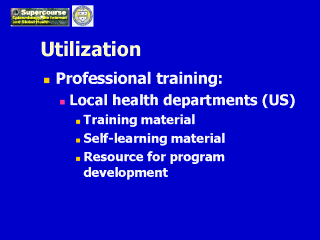 Supercoure lectures are used for professional training. It’s used by local health departments as the resource for program development. |