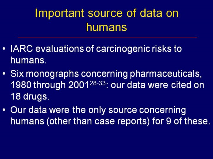The International Agency for Research on Cancer (IARC) publishes authoritative reviews of the evidence for carcinogenicity of chemicals including drugs. We believe that our data contributed to these reviews. |
