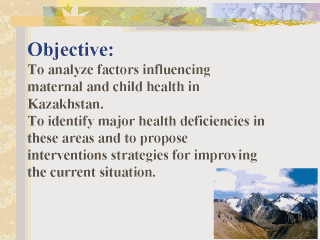 | Assessment was based on various literature sources including Kazakhstan Demographic and Health Survey 1999 by Academy of Preventive medicine of Kazakhstan and Macro International, Inc. |