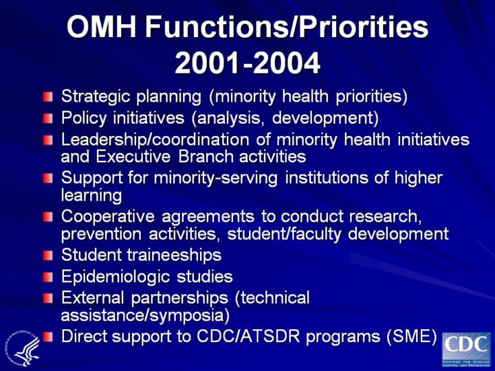 Establishing a Strategic Vision/Effective Execution Major functions and operations Supporting evidence - based policy and action Providing leadership for Special Initiatives and Policy Enhancing effective internal and external partnerships Enhancing internship/fellowship opportunities Undertaking research targeting key populations Support to CDC programs Seeking resources to support activities |