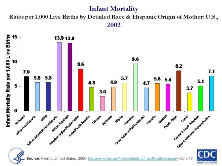 Another significant cause of disparities in infant mortality is disorders related to short gestation and low birthweight. Mortality data for 2001 for short gestation and low birthweight per 1,000 live births are as follow (6): All populations: 109.5 American Indian: 71.6 Non-Hispanic white: 76.2 Asian/Pacific Islander: 46.9 African American: 302.7 Hispanic/Latino: 78.9